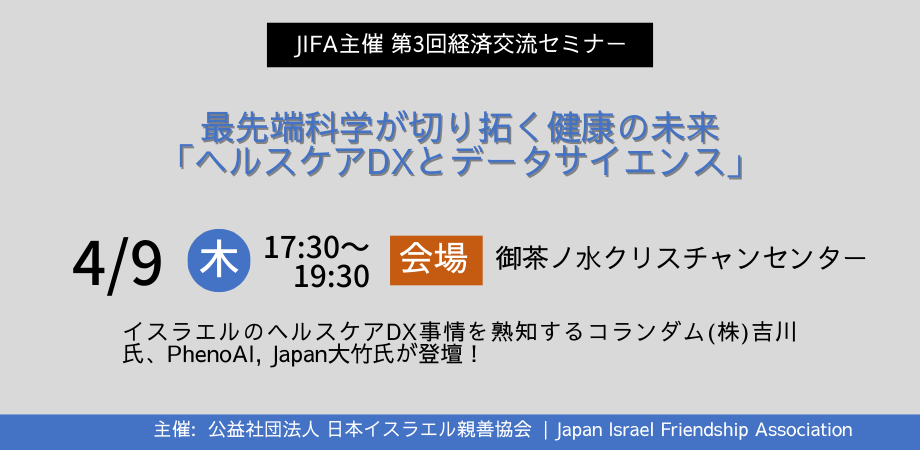 | 主催・申込・お問合せ | 公益社団法人 日本イスラエル親善協会 ビジネス交流委員会 お問合せ |