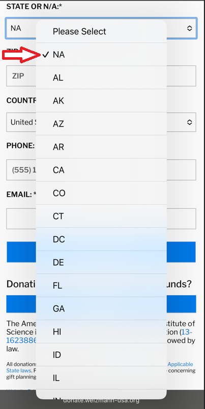 このサイトは米国向けなので、住所入力では、日本在住の我々は住所の州(STATE OR N/A)は、次の図のように「N/A」を選択。選択肢の最初にNAがない場合はタイプ入力。